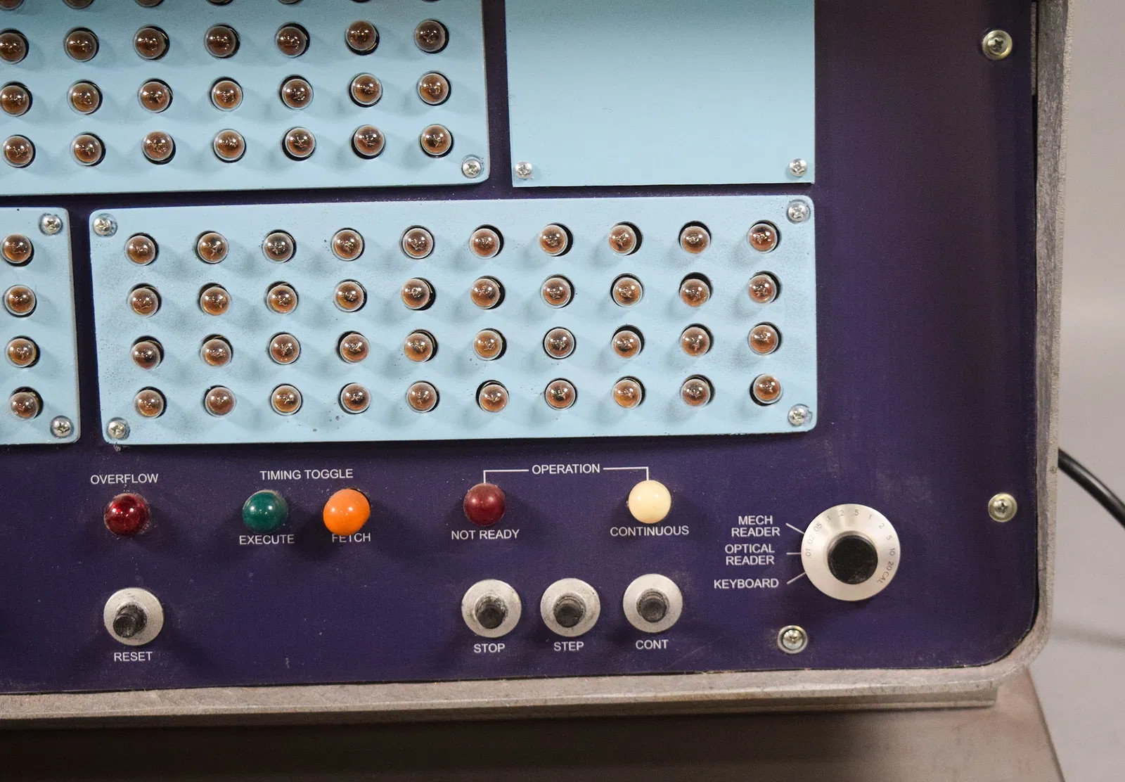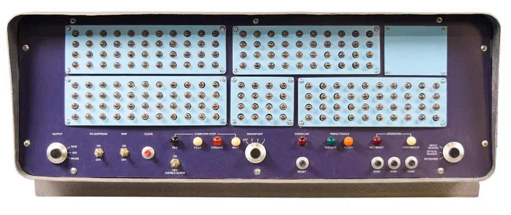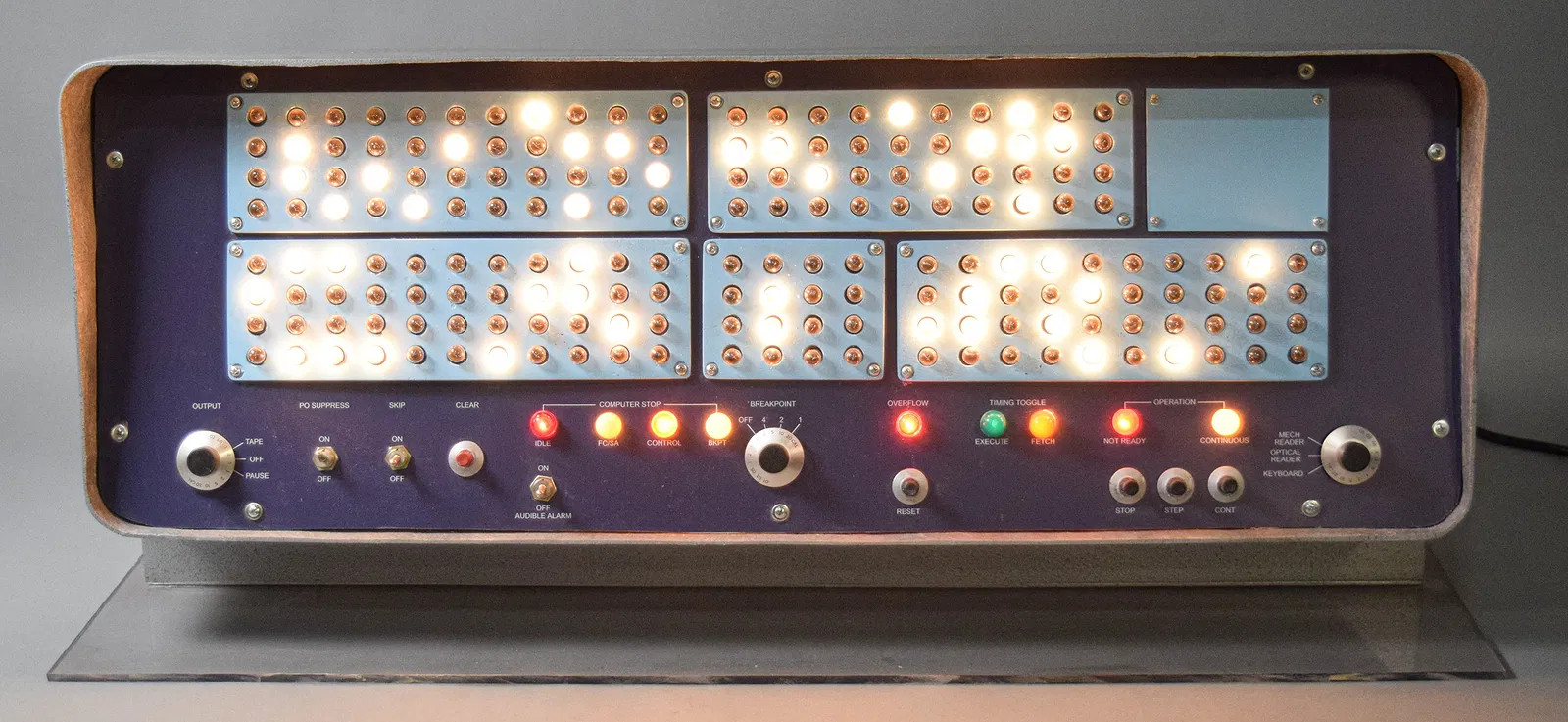 This is a replica of the Burroughs/Electrodata B205 control console, as seen in many Sci-Fi movies and TV shows. It is comprised of a fiberglass cabinet, with a wood base and acrylic front and rear panels. A thicker acrylic plate is attached to the bottom.