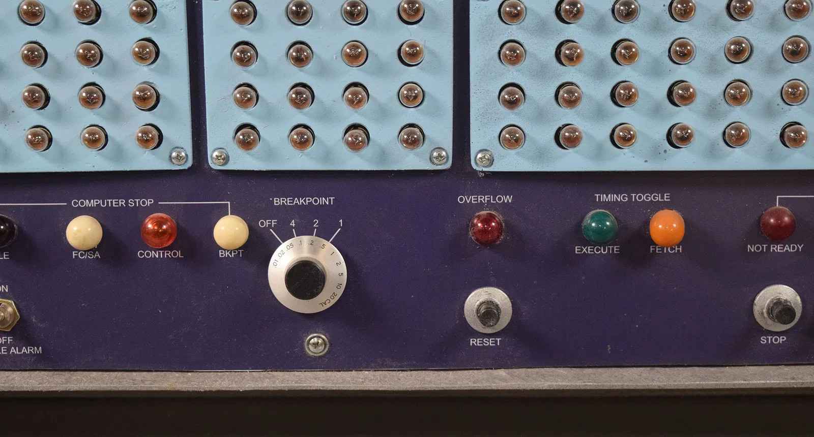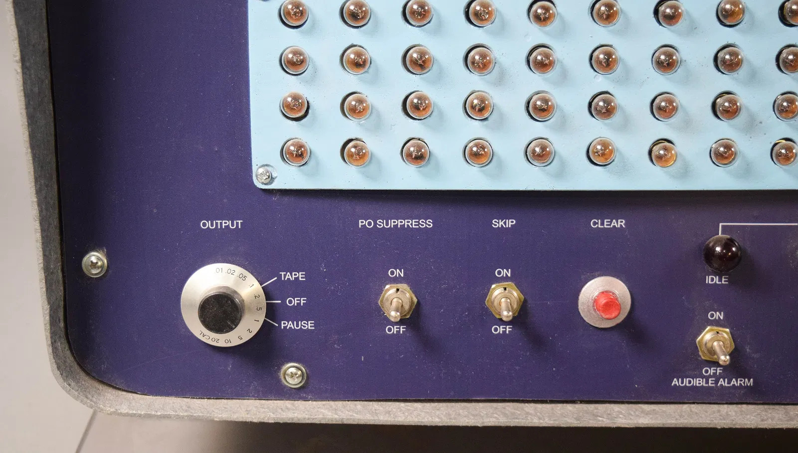 The front panel controls are all fakes, except for the three toggle switches. The PO SUPPRESS toggle turns on the flashing incandescant light display. The pushbuttons are all molded and non-functional. I'm told that the pushbutton switches are still available at various electronics dealers, should you wish to upgrade the unit. The dials appear to be from actual equipment, but are not correct for the B205 and are fastened to the panel by screws.